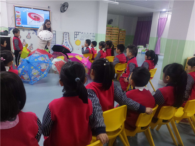 虽然小朋友在生活中见过各种各样的伞,却不知道伞是怎么做出来的,我们的助教老师带来了很多不同材质的伞,并对它们进行了详细的介绍。特别是在介绍油纸伞时,小朋友都发出了惊叹的声音,纷纷围观!